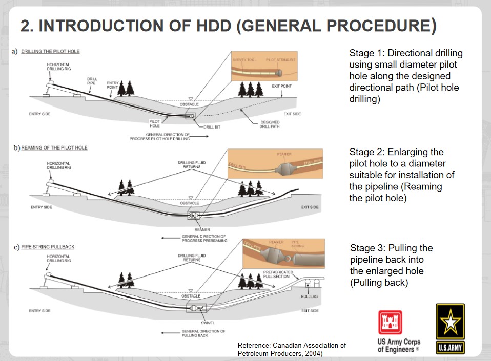 During HDD, the company will use a large auger to bore under the water body. It uses “drilling mud” as a lubricant and to keep the tunnel open. Once the tunnel is drilled, they will pull the pipeline through the tunnel.
